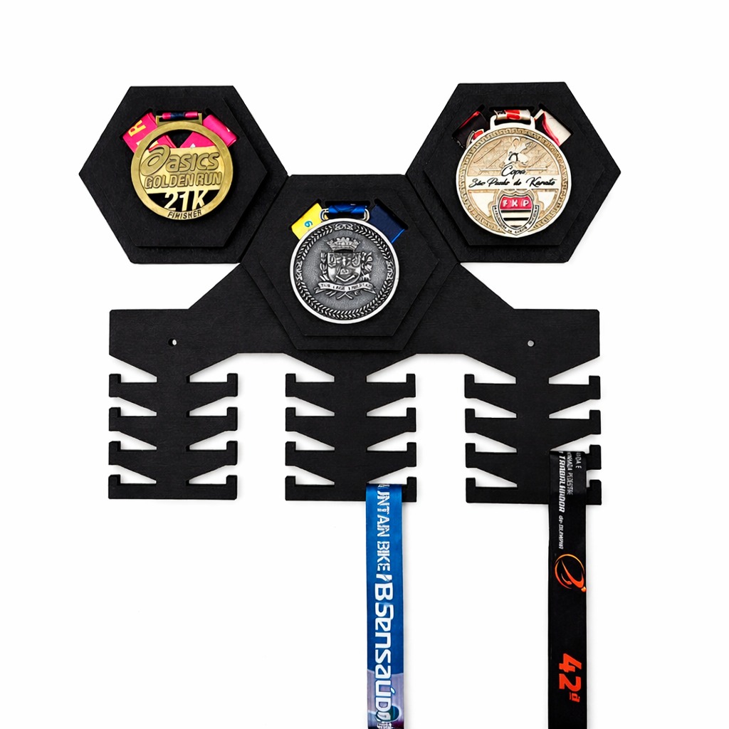 O Porta Medalhas Hexagonal Modular foi desenvolvido para atletas que valorizam cada medalha conquistada. Com design moderno e acabamento sofisticado, ele organiza e exibe suas premiações de forma elegante e imponente.